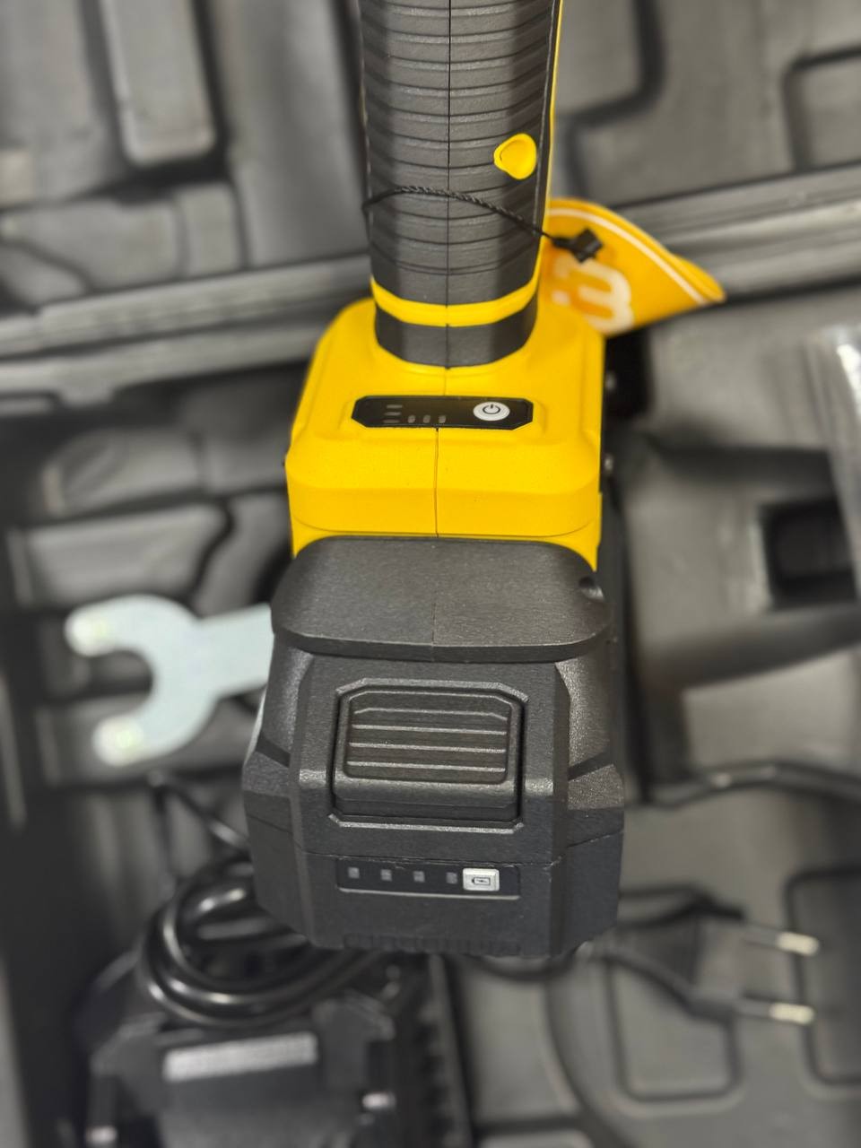 - Агрегат має акумуляторний тип живлення, при цьому літій-іонна батарея (21 В) кріпиться слайдерним чином, що гарантує можливість заміни, тому шліфувальну машину можна використовувати і в польових умовах;