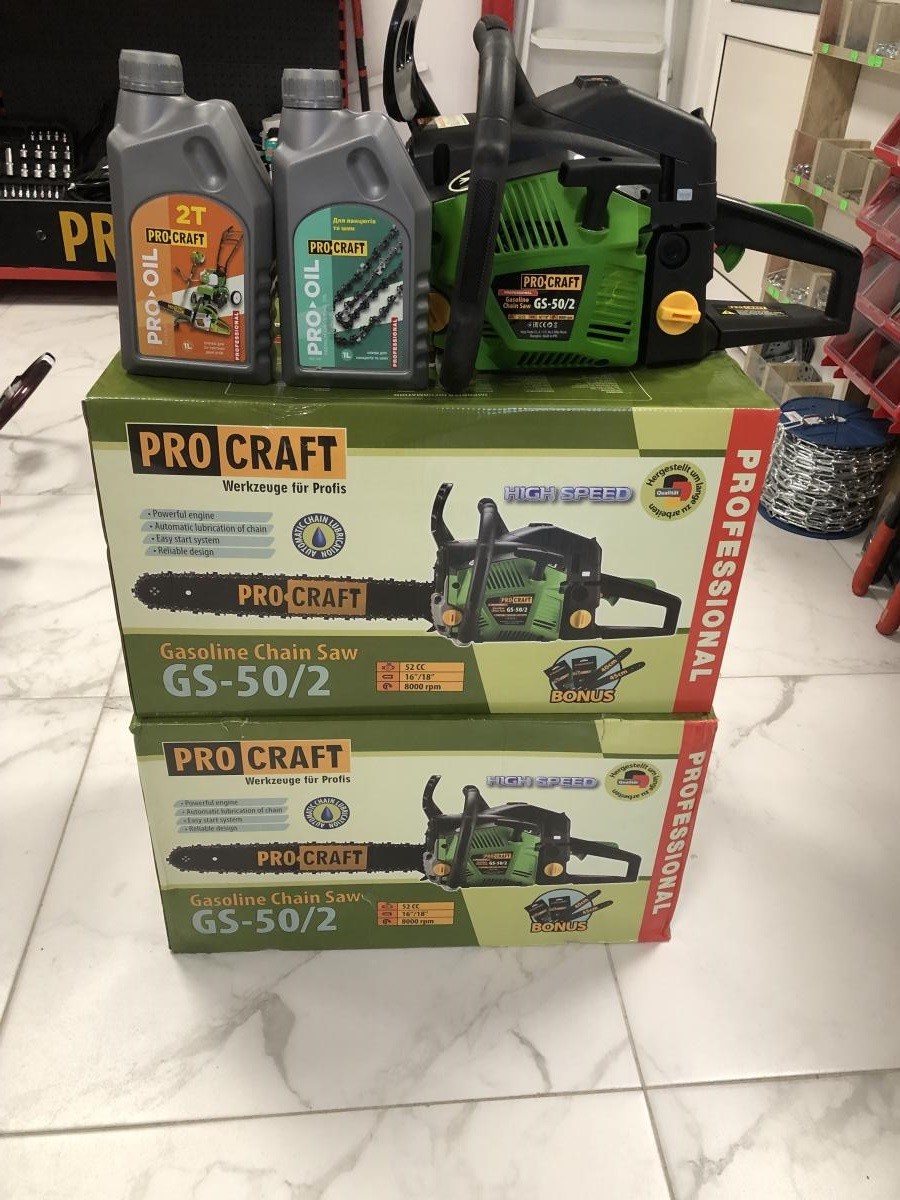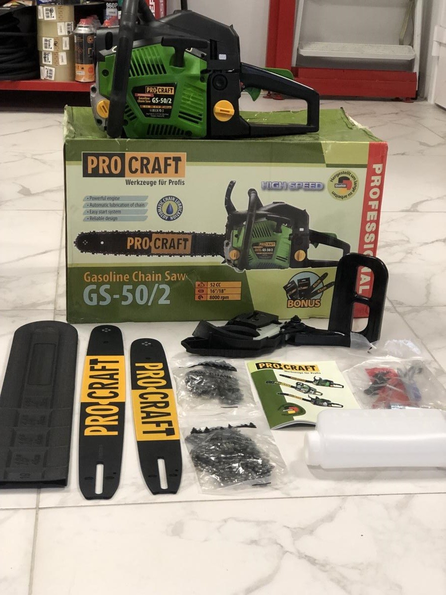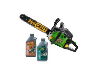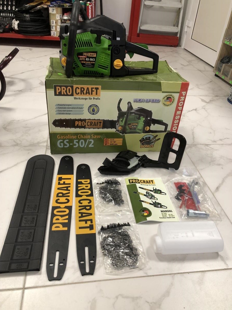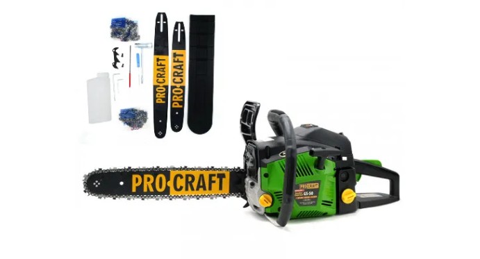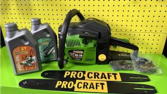 Procraft GS-50/2 має довжину шини в 400 мм та розбірну зірку, що дозволяє вам легко налаштовувати та замінювати ланцюг за потреби. Її металевий (магнієвий) картер забезпечує тривалий термін служби та захист від пошкоджень під час роботи. Ця бензопила спроектована для довгої та надійної роботи у найважчих умовах.