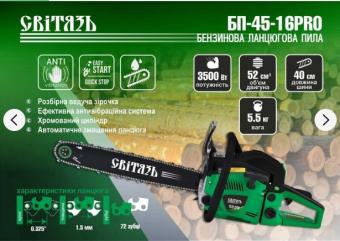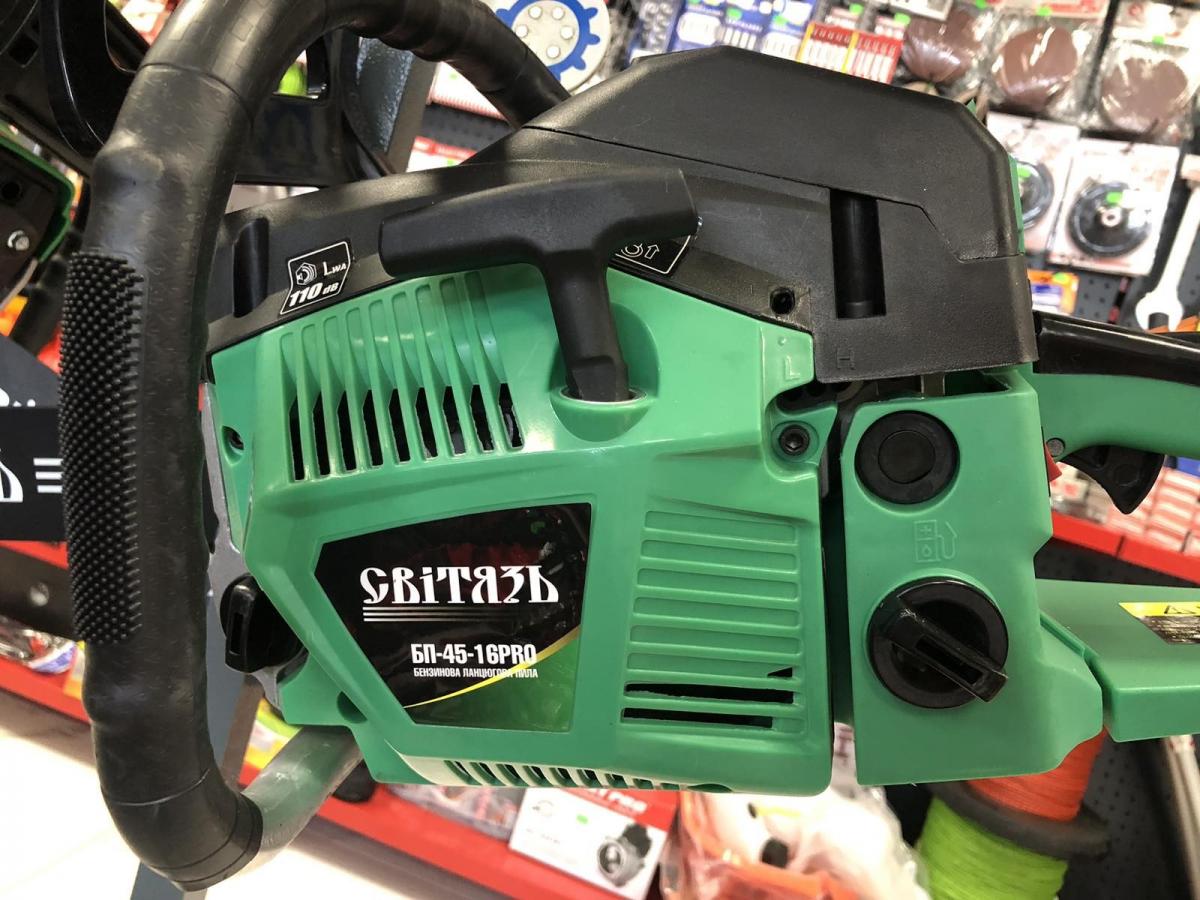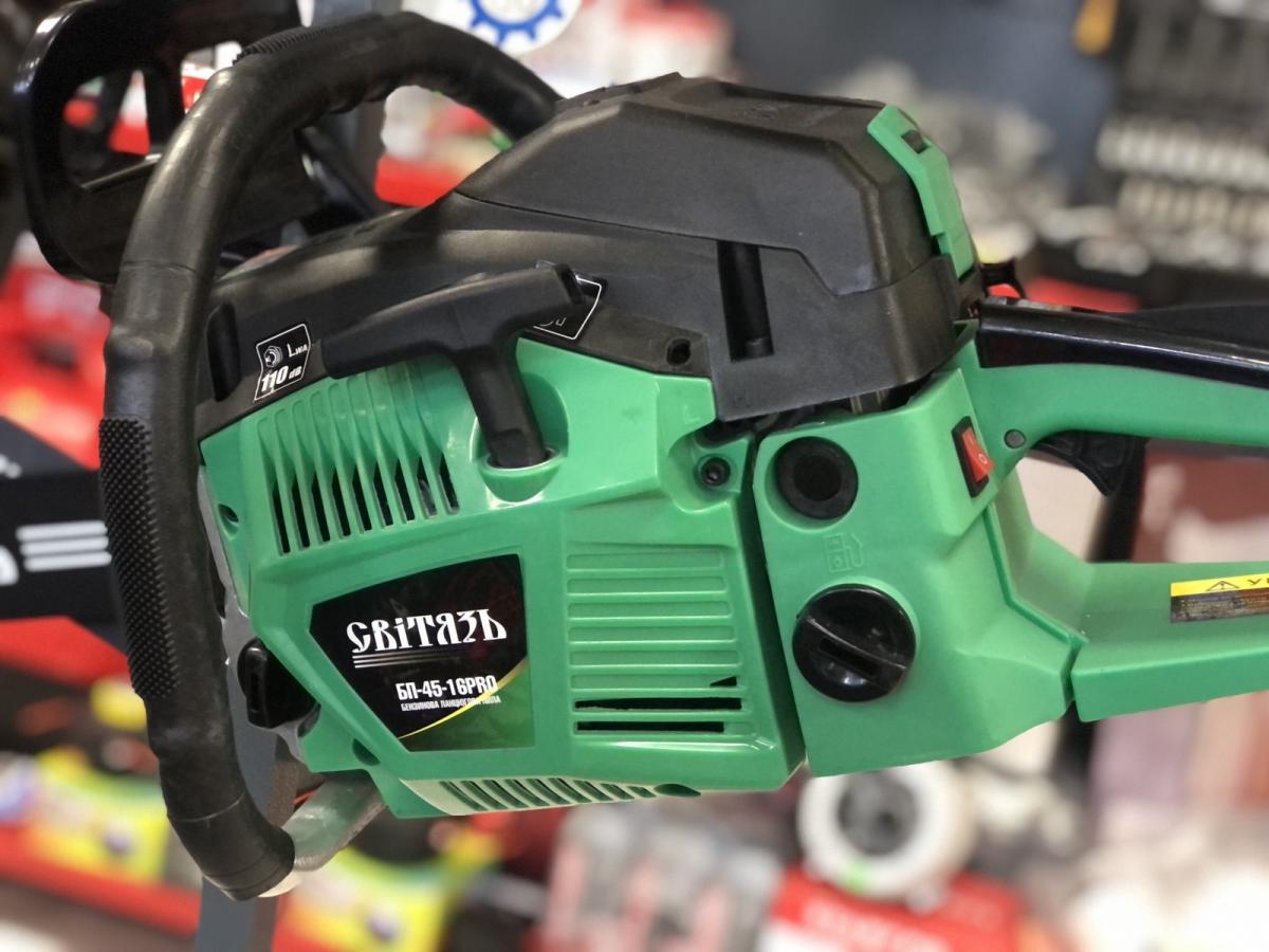 Бензопила цепная БП-45-16PRO Свитязь - качественный высокоэффективный инструмент. Важными плюсами этой модели является автосмазка цепи, хромированный цилиндр, а также индикатор уровня масла. Для удобного использования предусмотрена антивибрационная система, а для безопасности пользователя экстренное торможение и защита от обратного удара.