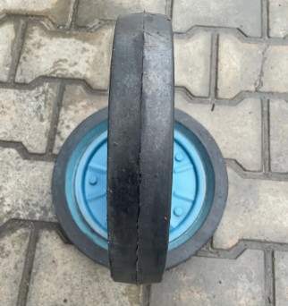 Таку стійкість до великих навантажень забезпечують сучасні та надійні матеріали диска та шини. Диск колеса суцільний і виготовлений із листової сталі методом штампування, покритої полімерною фарбою (колір — синій), а проколобезпечна покришка з чорної еластичної гуми.