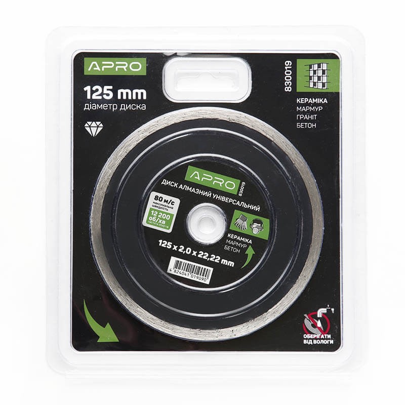 22-24% вміст алмазної крихти, 7 мм висота різальної крайки; Мінімальний залишок: 6; Кратність Вивантаження: 1; Вага: 0.154; Найменування для ИМ Укр: Диск до бетону 125х2,0мм (22-24%) суцільний APRO;