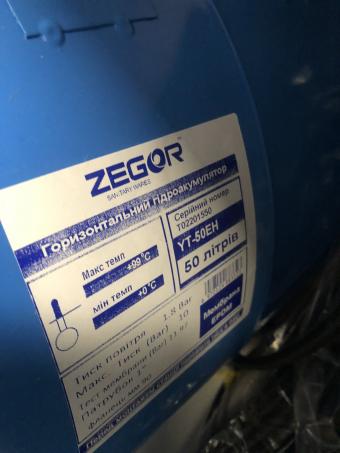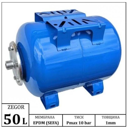 Описание Гидроаккумулятор Zegor YT-50EH 50 л Гидроаккумулятор Zegor YT-50EH горизонтальный 50 л для холодной и горячей воды предназначен для поддержания давления в системах автономного водоснабжения, для компенсации гидроударов, а также накопления воды. Корпус изготовлен из высококачественной стали и покрыт защитной эмалью синего цвета. Пространство гидроаккумулятора разделено сменной мембраной на две камеры: водяную и воздушную. В воздушной камере находится предварительно закачанный под давлением воздух. Контакт воды с металлическими поверхностями корпуса мембранного бака невозможен, поскольку вся вода поступает в водяную камеру мембраны, материалом которой является износостойкий резиновый материал, не восприимчивый к действию бактерий и удовлетворяющий всем гигиеническим и санитарным нормам для питьевой воды. Со стороны воздушной камеры в корпусе мембранного бака размещается пневмоклапан, предназначенный для регулировки давления воздуха....