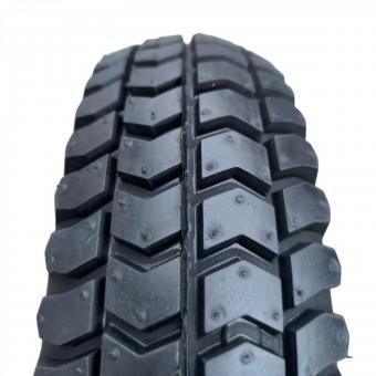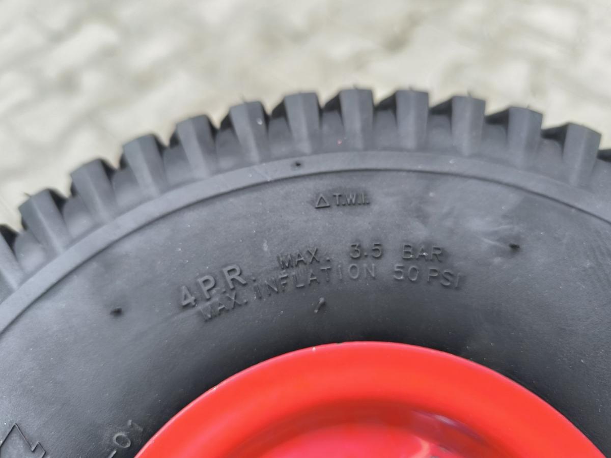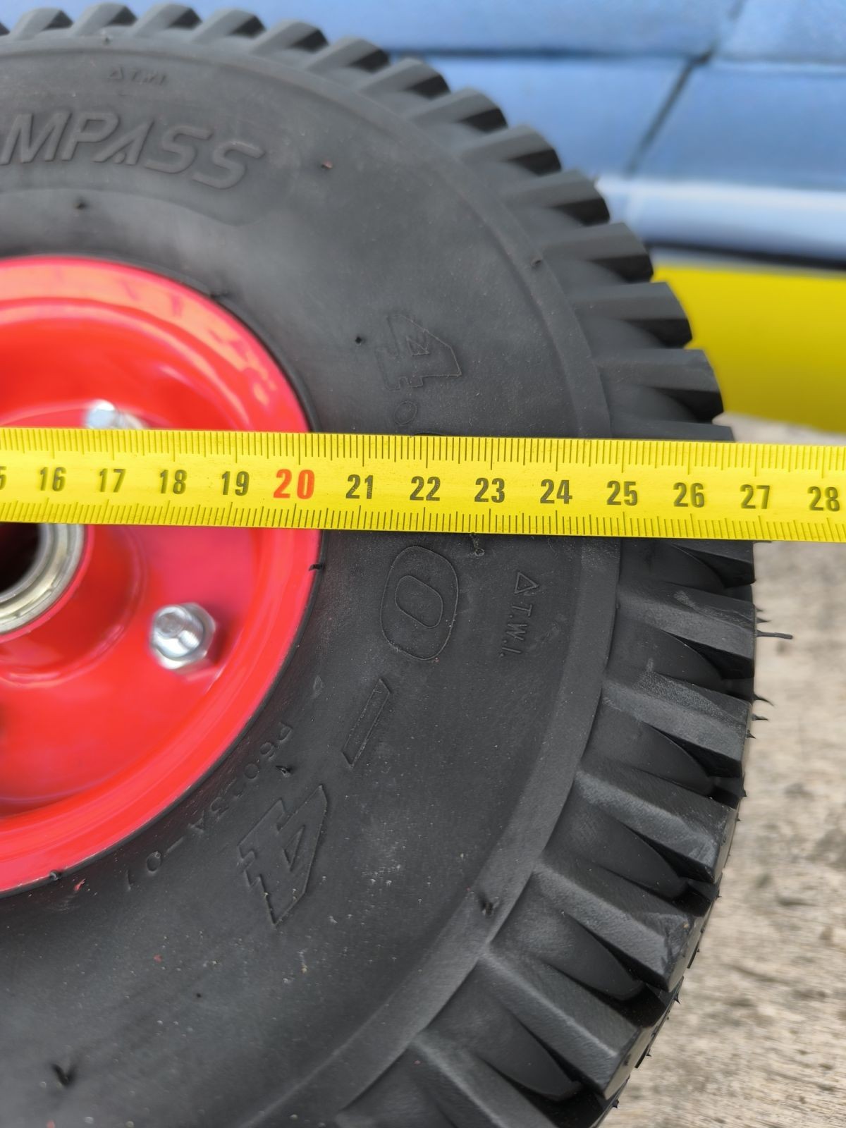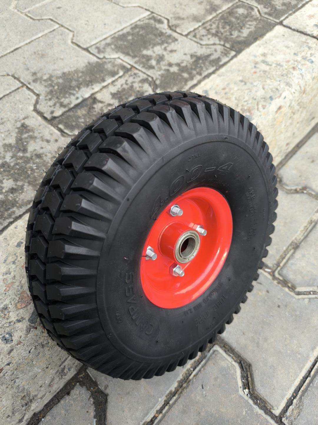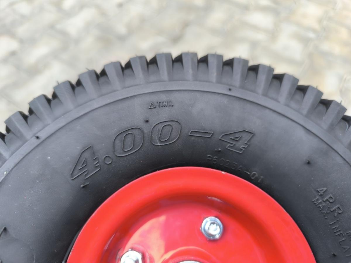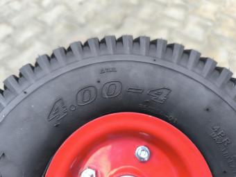 Колесо має розмір 4.00-4, що означає ідеальне співвідношення висоти та ширини, забезпечуючи плавний рух навіть по нерівній місцевості. Шина виготовлена за технологією 4PR (4 Ply Rating) — це чотиришарова конструкція, яка додає міцності, захисту від проколів і довговічності. Таке колесо витримує великі навантаження і чудово поводиться на гравії, землі, піску або щебені.