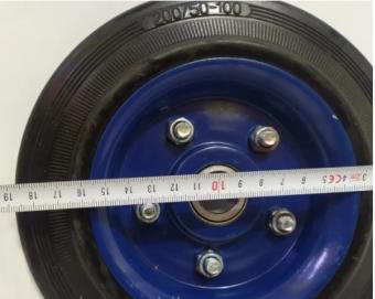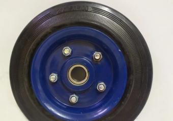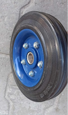 Колесо на стандартній чорній гумі модель 400200 діаметром 200 мм одне з найпоширеніших у використанні на ринку України. Складається зі сталевого оцинкованого диска, литої еластичної гумової шини чорного кольору, що не потребує обслуговування кулькового підшипника, який відповідає за легкість і плавність ходу.