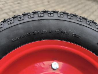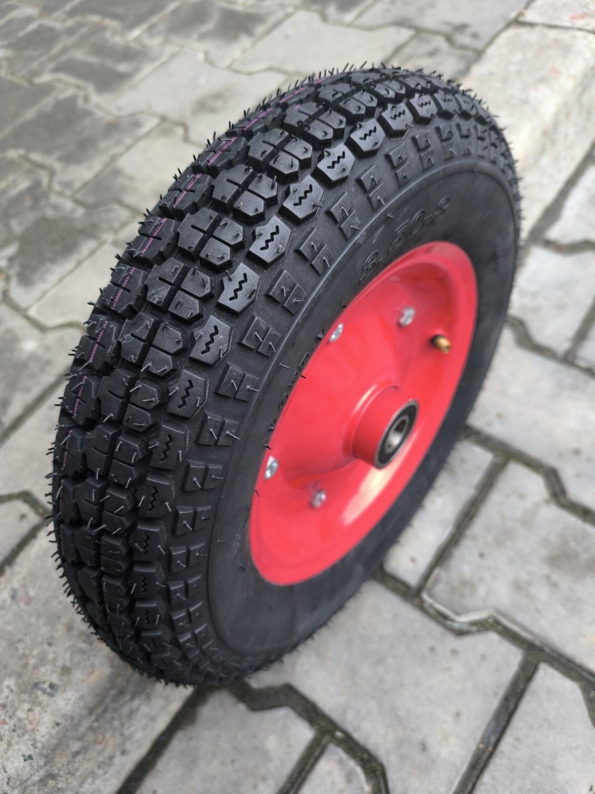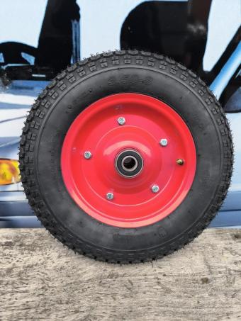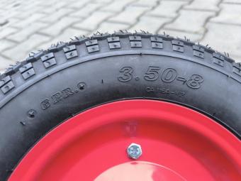 Колесо в зборі 3.50-8. Пневматичне колесо призначене для тачок та візків. Перевагою таких коліс є легке та плавне пересування бездоріжжям. За рахунок відмінної амортизації, удари коліс об каміння практично не передаються на корпус візка.