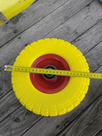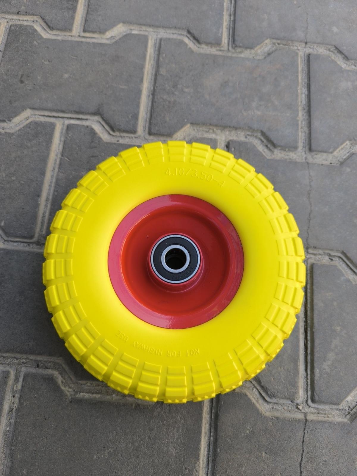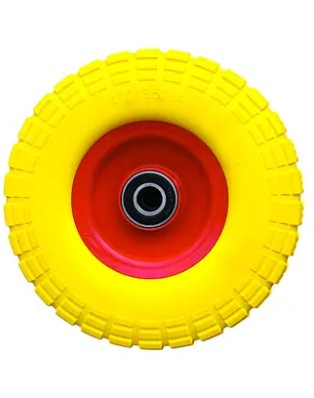 Пінополіуретанове колесо поєднує в собі відразу декілька якостей, по-перше, воно має досить м'який хід як пневматичне, а також воно не боїться проколів як колесо з цільної гуми. Але на відміну від литого колеса воно легке і не обтяжує Вашу тачку. Диск даного колеса виготовлений з металу, а по обидва боки маточини вставлено два підшипники. Така конструкція дозволяє легко встановити колесо на стандартну вісь. І тепер ви зможете спокійно перевозити ваш візок де завгодно не боячись проколоти колесо. Тому що шина виготовлена із спіненого поліуретану. Таким чином ви отримуєте м'який хід і захист від проколів.