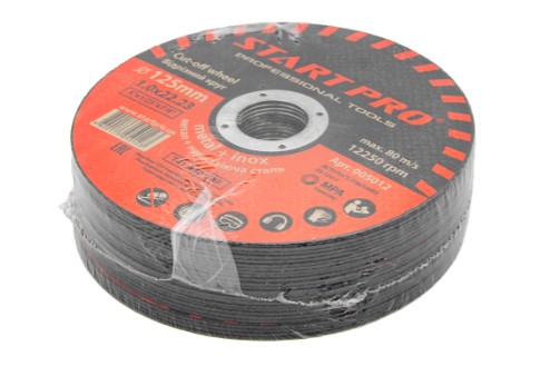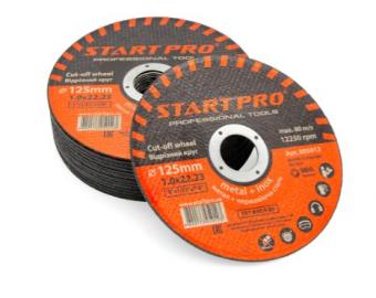 Круг відрізний START PRO 125 x 1,0 x 22,23 (метал+нерж.сталь) - кругла міцна армована насадка бакелітовим матеріалом, з наскрізним отвором в центрі. Призначена для роботи з металом та нержавіючою сталлю. На диску вказані виробником важливі відомості про насадку та її застосування - зовнішній діаметр - 125мм товщина 1.0 мм та розмір посадкового отвору 22.23 мм. Максимально допустима кутова швидкість роботи диска досягає 80 м/сек, максимально допустима швидкість обертання диска-12250 об/хв, тонкий диск має велику пружність, і здатний згинатися під навантаженням, розрахований для інструменту середньої потужності. Матеріал з якого виготовлені абразивні зерна на диску -електрокорунд з розміром зерна 60, в буквеному позначенні -А 60. Насадка за ступенем твердості - позначена літерою S, що означає - тверда, тип зв'язування BF - армований бакеліт, конструктивний тип - Т41 плоский.