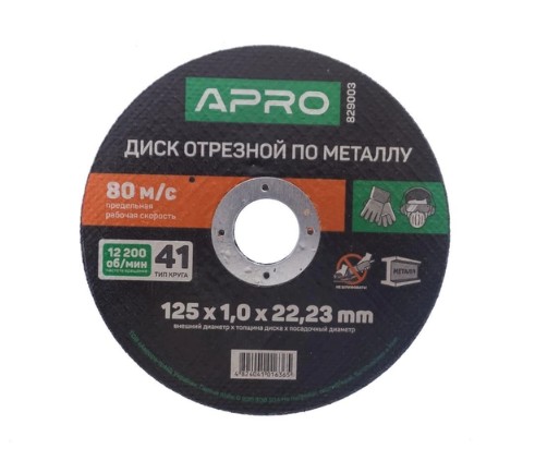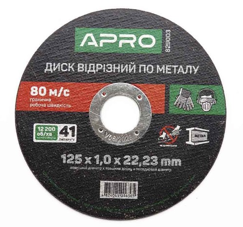 Виробник: Apro, Тип: Круг відрізний по металу, Діаметр, мм: 125, Діаметр кріплення, мм: 22.22, Товщина, мм: 1