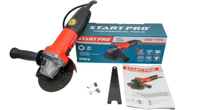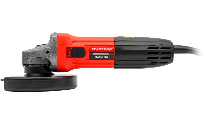 Кутова шліфмашина START PRO SAG-1170 – інструмент для різання та шліфування різних матеріалів (металів, каменю, бетону та ін). Відмітними особливостями є компактний корпус і вага, що дозволяє, при необхідності, виконувати роботи однією рукою, а низькопрофільний корпус редуктора забезпечує можливість використання в труднодоступних місцях чи обмеженому просторі. Редуктор виконаний на 2-х підшипниках, що значно підвищує термін служби зубчатих шестерень і зменшує вібрації при експлуатації.