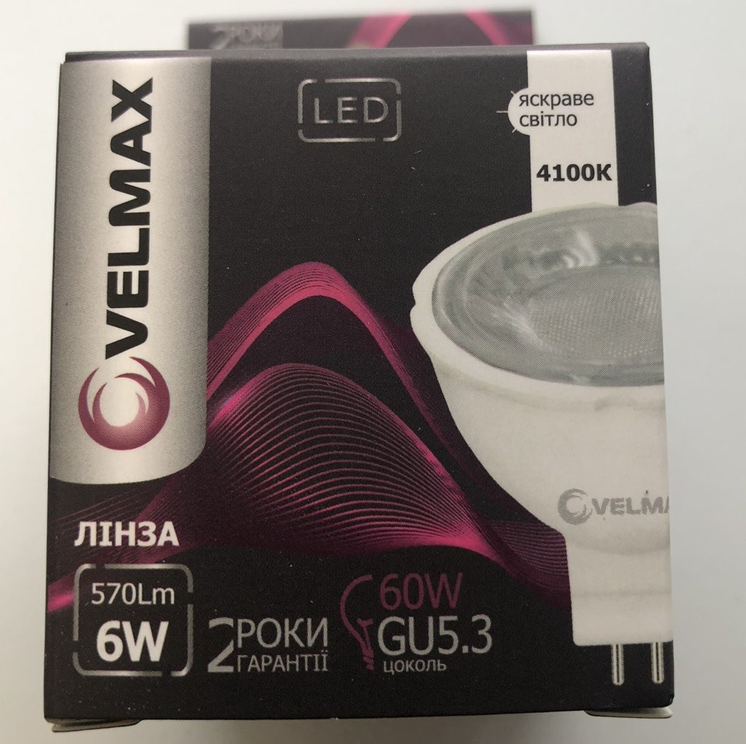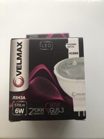 LED лампа VELMAX V-MR16, 6W, GU5.3, 4100K, 570Lm, лінза з цоколем GU5.3 - відмінний вибір, якщо ви хочете заощадити і отримати якісне і довговічне джерело світла. Потужність лампи становить 6 W, що аналогічно лампі розжарювання в 60 Вт.