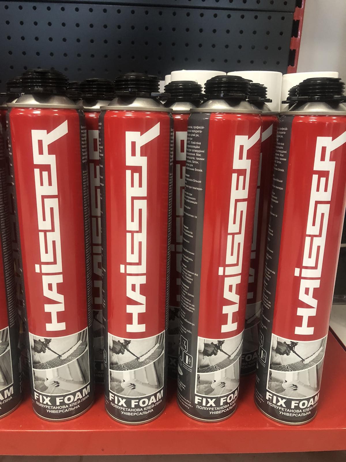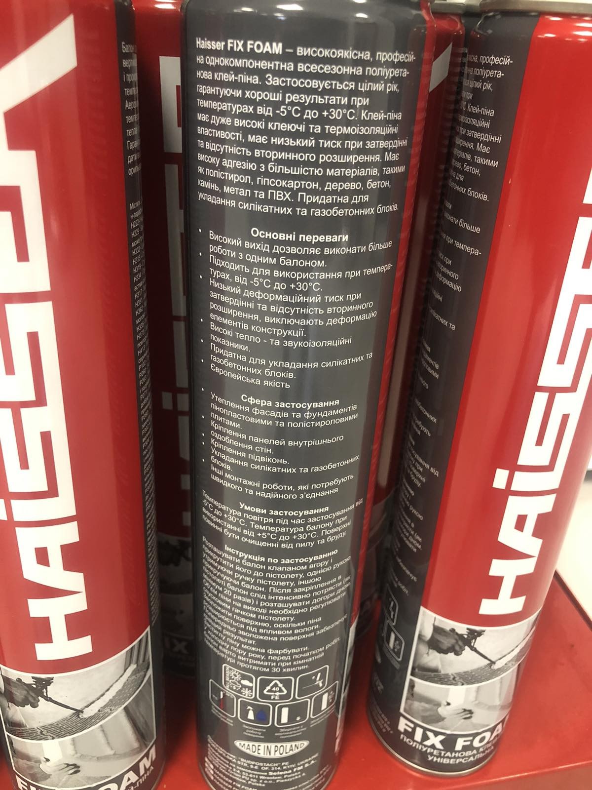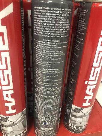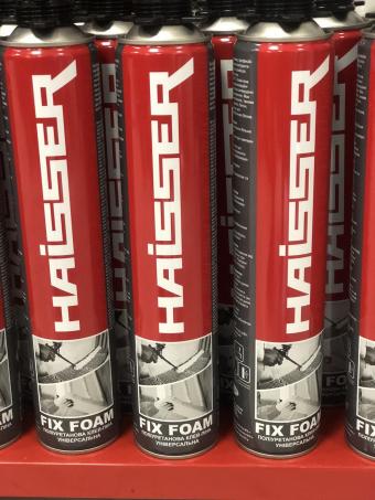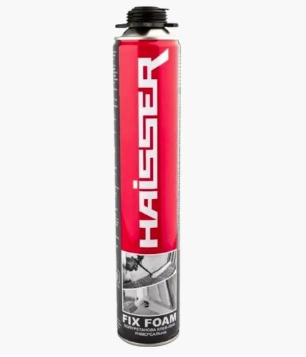 Haisser FIX FOAM – високоякісна, професійна однокомпонентна всесезонна поліуретанова клей-піна європейського виробництва. Клей-піна має дуже високі клеючі та термоізоляційні властивості, має низький тиск при затвердінні та відсутність вторинного розширення. Має високу адгезію з більшістю матеріалів, такими як полістирол, гіпсокартон, дерево, бетон, камінь, метал та ПВХ. Придатна для укладання силікатних та газобетонних блоків.