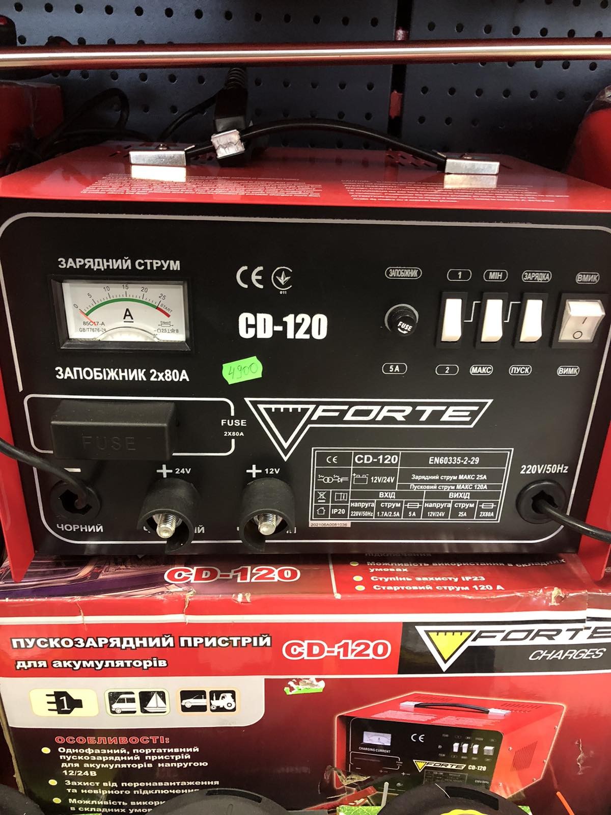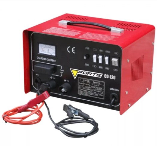 Опис Forte CD-120 Пускозарядний пристрій Переносні пуско-зарядні пристрої, що працюють від мережі змінного струму, дуже зручні у використанні не тільки на станціях технічного обслуговування, але і в побутовому секторі. Автолюбителі розміщують такі прилади в своїх гаражах, благо вони не вимагають для своєї установки великої площі, аби поблизу був джерело електричного струму для підключення. Зарядка акумуляторів в якісних зарядний пристрій виробляється в умовах візуального та автоматичного контролю процесу, а додаткові функції управління і захисту дозволяють зробити тонке налаштування і уникнути виходу з ладу як батарей, так і приладів. FORTE CD-120 - універсальне пуско-зарядний обладнання, яке працює з різними типами акумуляторів і двигунів. Завдяки своїй компактності (його розміри - 375х260х210 мм) воно легко розміщується навіть в приміщенні малої площі, а металевий корпус забезпечує надійний захист внутрішньої електроніки від механічних пошкоджень. Вентиляційні отвори, розташовані на трьох площинах приладу, роблять систему повітряного охолодження досить ефективною для успішного охолодження мікросхем і електронних компонентів. За допомогою цього пуско-зарядного пристрою можна виробляти зарядку акумуляторних батарей ємністю від 50 до 300 ампер-годин і запускати двигуни струмом запуску 20 ампер. Корпус FORTE CD-120 виконаний в стандартному для цього модельного ряду стилі, характеризується мінімізацією і строгістю. У верхній частині передньої панелі розташовані аналоговий амперметр, перемикачі зарядки-пуску, величини напруги, ручка регулювання вихідного струму і тумблер відключення електроживлення. У нижній частині знаходяться вхідне гніздо для кабелю зовнішнього живлення і вихідних кабелів для підключення зовнішніх акумуляторів. На верхній панелі корпусу розташована транспортувальна ручка із пластику. FORTE CD-120 працює від мережі змінного струму 220 вольт. На виході прилад виробляє напругу 12 або 24 вольта, при цьому максимальний струм зарядки становить 16 ампер. Захисні функції приладу допомагають уникнути його перегріву, виходу з ладу при неправильному підключенні акумуляторів, короткому замиканні і перевантаження. Використання FORTE CD-120 дозволяє ефективно заряджати сіли акумулятори та виробляти пуск двигуна навіть при дуже низькій температурі навколишнього середовища.