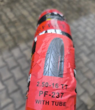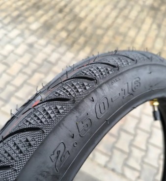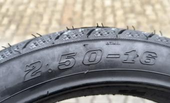 Доступна гума розміром 2.50-16 для скутерів від Duro. Це камерна покришка з максимальним навантаженням на колесо до 145 кг.
