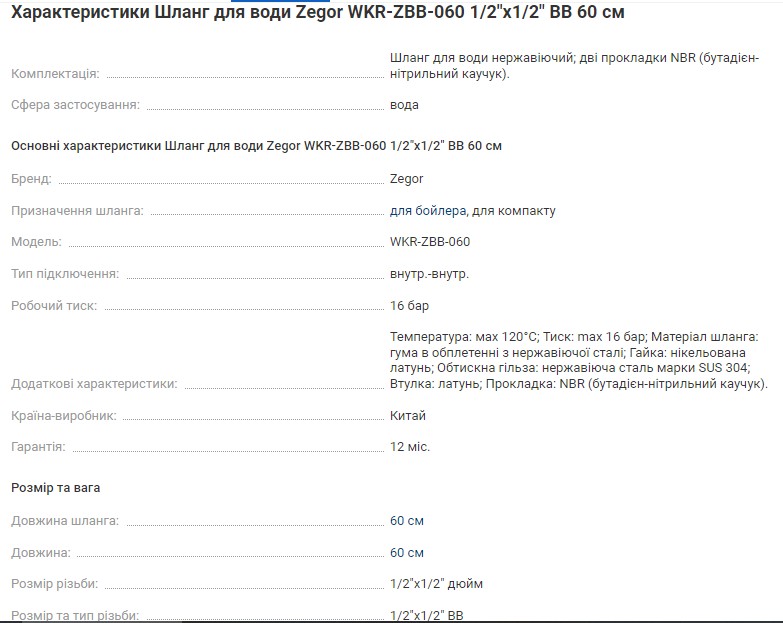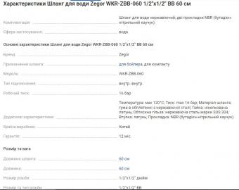 Шланг для води нержавіючий ZEGOR WKR-ZBB-060 1/2"х1/2" ВВ 60 см — гнучкий шланг з накидними гайками, обплетення якого виготовлено з якісної нержавіючої сталі AISI 201. Призначення – підведення води та теплоносія до сантехнічних приладів: пральні та посудомийні машини, газовим котлам, електричним водонагрівачам, газовим колонкам та ін.