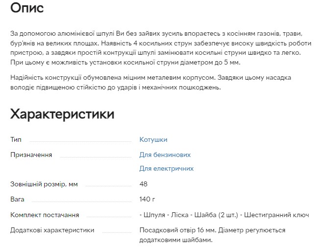 За допомогою алюмінієвої шпулі Ви без зайвих зусиль впораєтесь з косінням газонів, трави, бур'янів на великих площах. Наявність 4 косильних струн забезпечує високу швидкість роботи пристрою, а завдяки простій контрукції шпулі замінювати косильні струни швидко та легко. При цьому є можливість установки косильної струни діаметром до 5 мм.