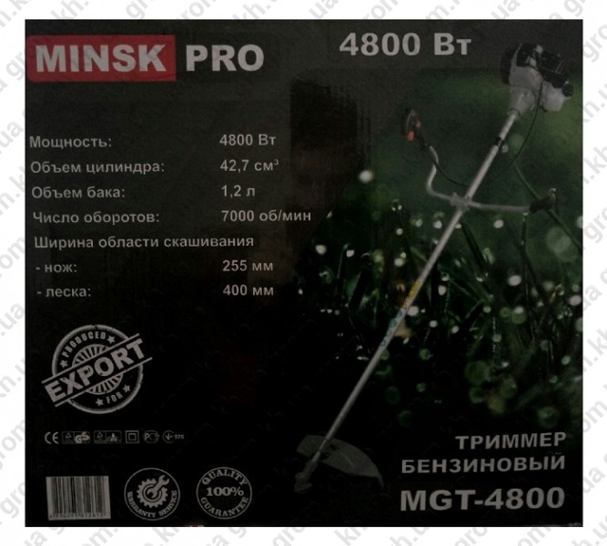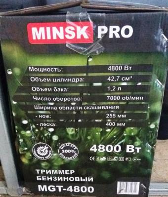Тример бензиновий MINSK PRO MGT-4800 універсальний бензиновий тріммер розроблений спеціально для скошування трави волосінню або ножем в будь-яких умовах. Тример MINSK PRO моделі MGT-4800 оснащений потужним двигуном 4800 Вт обсягом 42,7 см. Куб., Завдяки якому досягається швидкість обертання валу 7000 об / хв. Наявність цілісної штанги з жорстким валом знижує кількість вібрацій практично до нуля, ручка газу в даній моделі оснащена для комфорту в роботі широким курком. Збалансована конструкція і невелика вага мотокоси забезпечують легкість в управлінні і високу продуктивність. Тример MINSK PRO MGT-4800 має в своєму арсеналі регульовану, двосторонню рукоятку, яка забезпечить комфортне керування, а ремінь через плече дасть можливість розподілити навантаження.