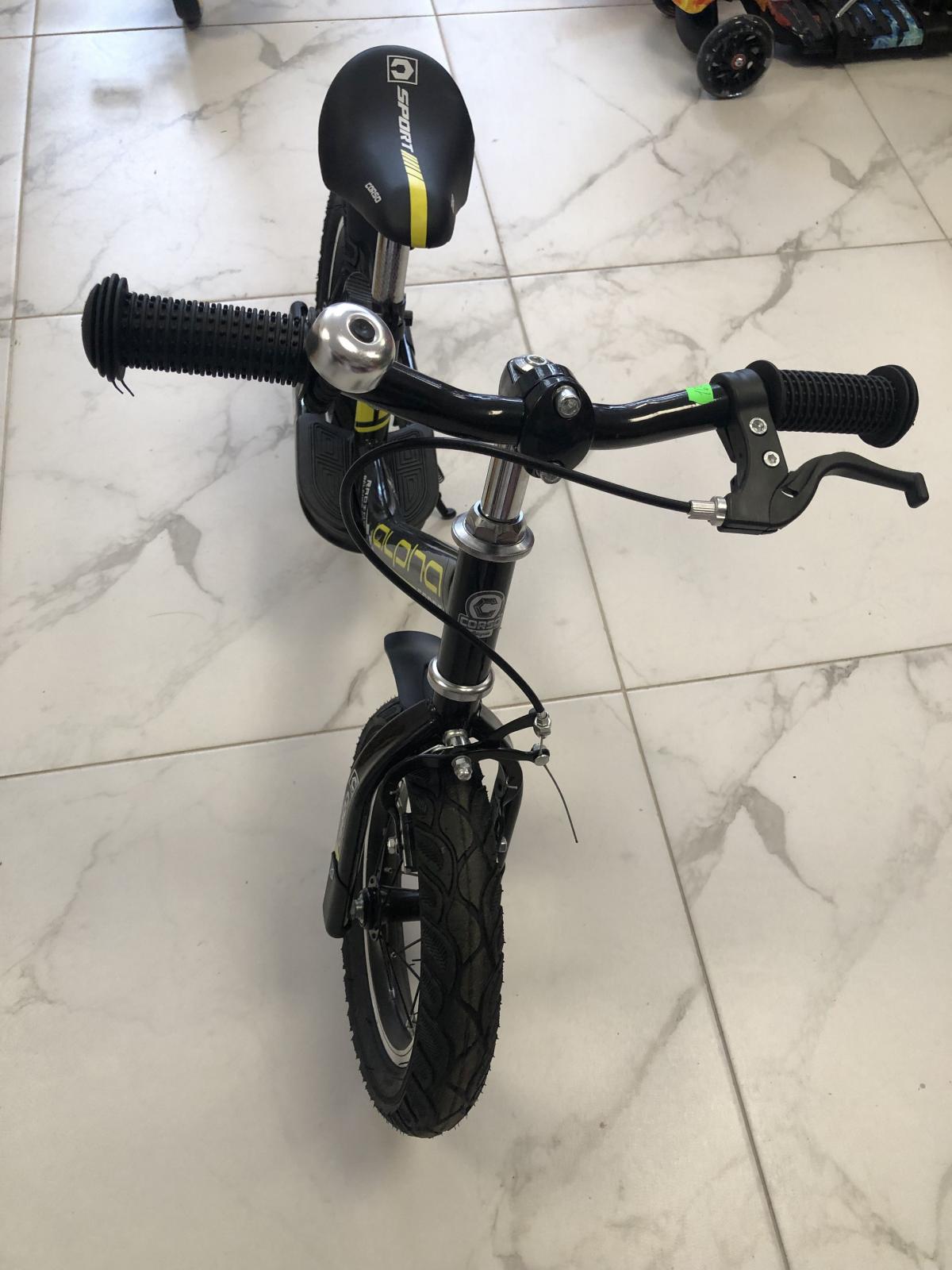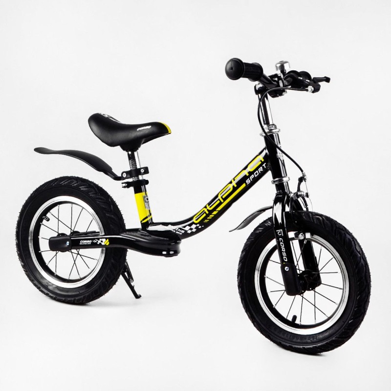 Велобіг Corso Alpha Sport (сталева рама, надувні колеса 12", ручне гальмо, підніжка, крила, дзвіночок). Чорне з жовтим