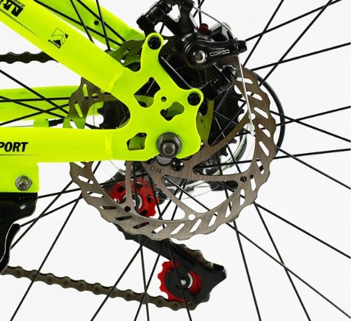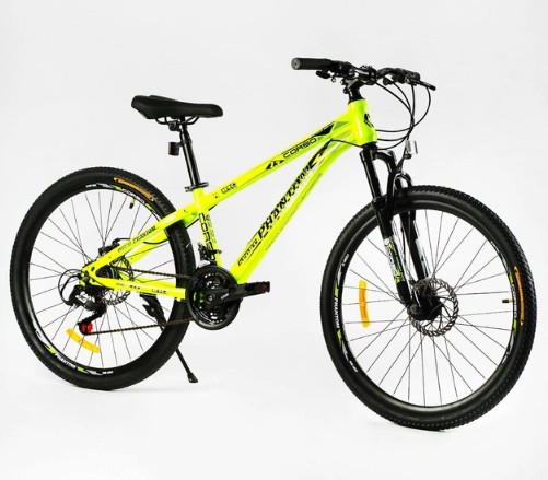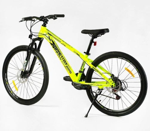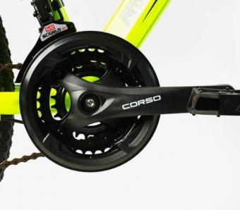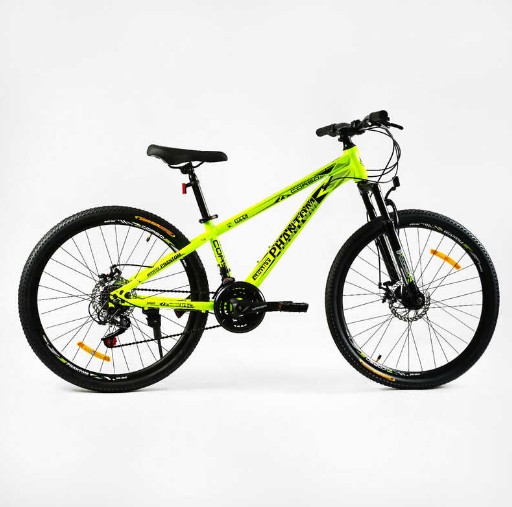 Спортивний гірський велосипед CORSO Phantom з дисковими передніми та задніми гальмами. Рама 13 дюймів, виготовлена з міцної сталі. Передній амортизатор встановлений на вилці переднього колеса. Колеса 26 дюймів із подвійними протиударними ободами з алюмінію, забезпечують стійкість і комфорт під час їзди нерівностями дороги. На велосипеді встановлена підніжка. Зручне спортивне сидіння з можливістю регулювання висоти. Кермо регулюється по висоті. Велосипед має 21 швидкість Оптимальний зріст велосипедиста 135-150 см.