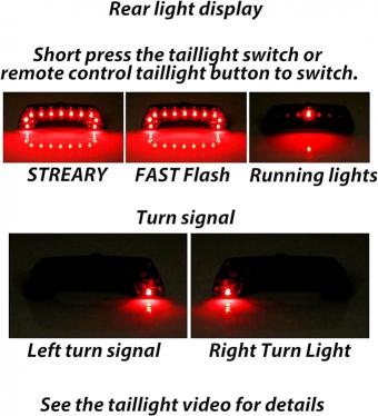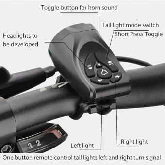 Велосипедний поворотний ліхтар має п’ять режимів освітлення заднього ліхтаря, а також за допомогою звукового сигналу, відповідно для режиму постійного освітлення заднього ліхтаря, режиму спалаху заднього ліхтаря, режиму ходових вогнів, лівого і правого вказівників повороту.