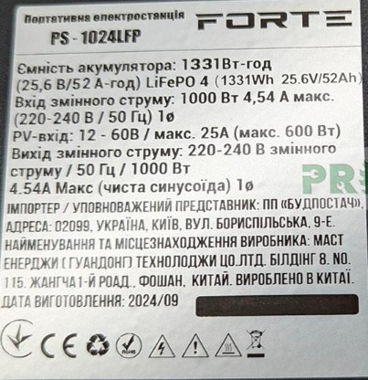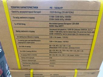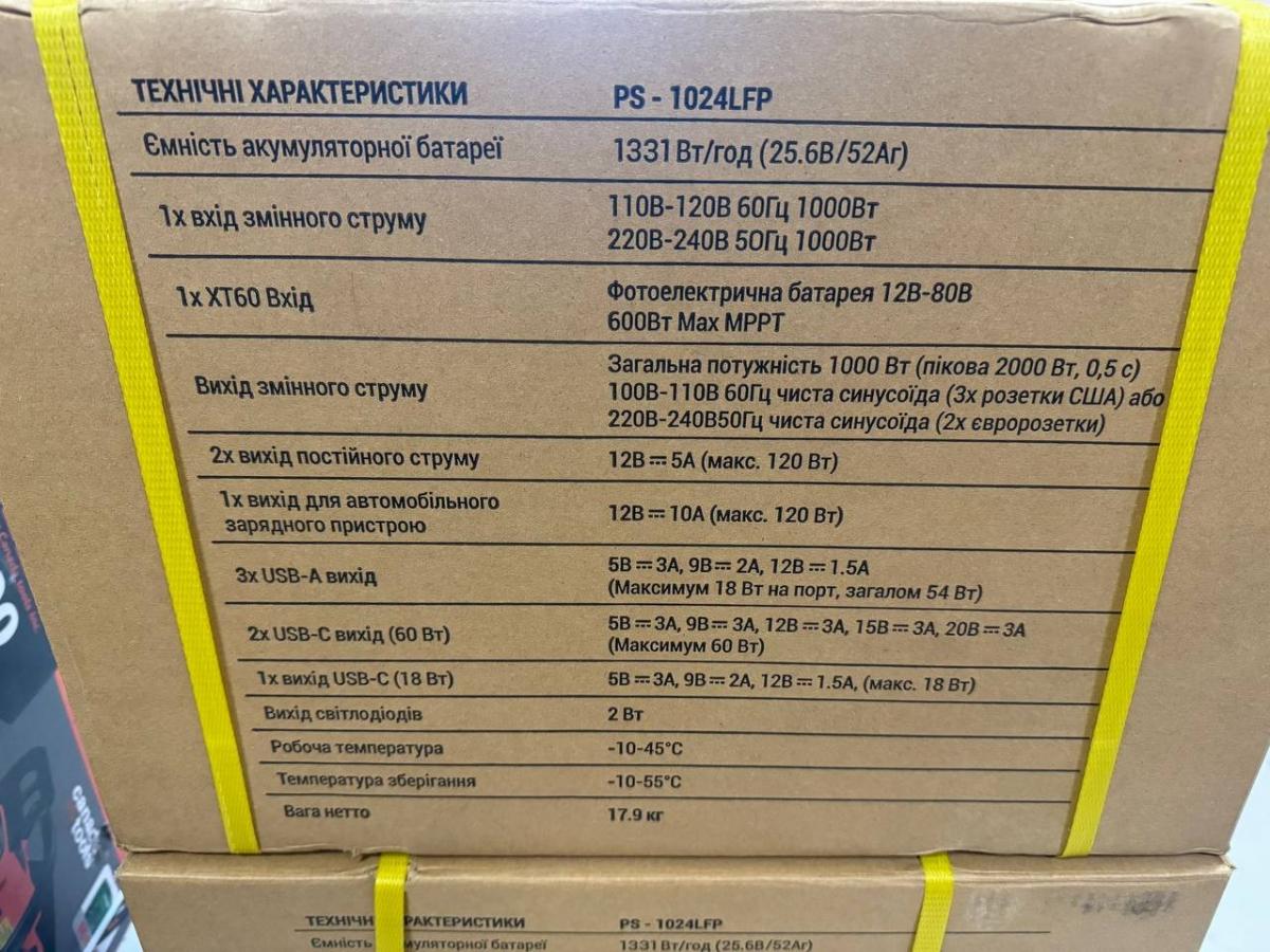 -Вихід зміного струму Загальна потужність 1000 Вт (пікова 2000Вт. 05.с) 100В-110В 60 Гц чиста синусоїда (3х розетка США) або 220В-240В 50 Гц чиста синусоїда (2х євророзетки) -2х вихід постійного струму 12В-5А (макс 120 Вт) -Вихід для автомобільного зарядного пристрою 12В-10А ( макс. 120 Вт) -3хUSB-А вихід 5 В-3А, 9В-2А, 12В-1.5А -2хUSB-С вихід (60 Вт) 5 В-3А, 9В-2А, 12В-1.5А, 158 -3А, 20В-3А -1хUSB-С вихід (18 Вт) 5 В-3А, 9В-2А, 12В-1.5А, -Вихід світлодіодів 2 Вт