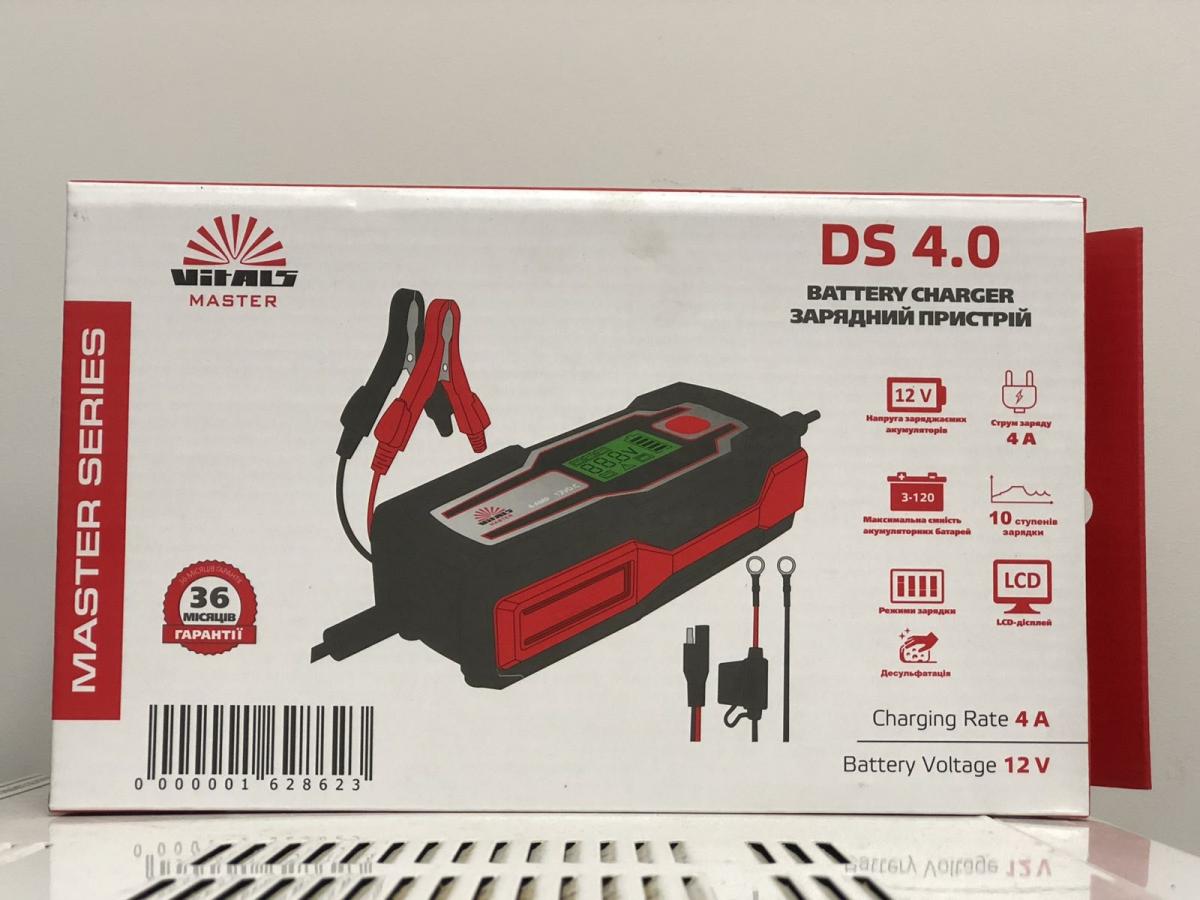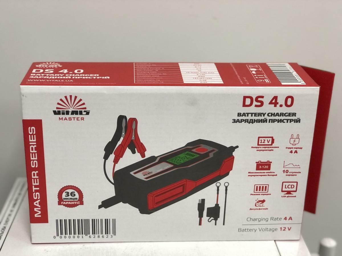Зарядний пристрій Vitals Master DS 4.0 - управляється мікропроцесором та системою з багатоступеневим циклом заряджання. Цей зарядний пристрій підходить для батарей: 6 В мотоциклів, 12 В автомобілів, а також для акумуляторів катерів, газонокосарок, гідроциклів, сільськогосподарської техніки, промислового та побутового обладнання.
